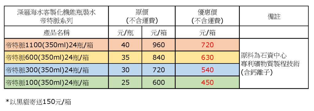 1. 深層海水客製化機能瓶裝水 帝特脈系列 (高鈣低鎂)/ETDIC原料