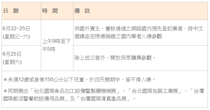 「台北國際食品展」為台灣規模最大、也是最為國際化的食品專業採購展覽會,每年6月皆吸引了許多來自國內外的專業買主前來台採購參觀,堪稱亞洲不可錯過的食品盛會,亦為全球華人食品業界不容缺席的年度場合。2015年總計有1,088家廠商,展出2,140個攤位,本展結合食品機械、包裝、餐飲設備和清真食用品四展,五展合計共有1,642家廠商,3,920個攤位,第二十六屆「台北國際食品展」將於2016年6月22日~25日於南港展覽館和世貿一館同步開展。