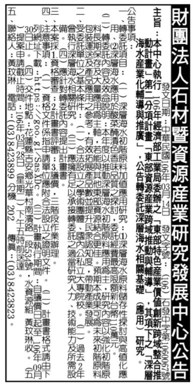106石資中心公告轉委託深層海水相關基礎(應用)研究