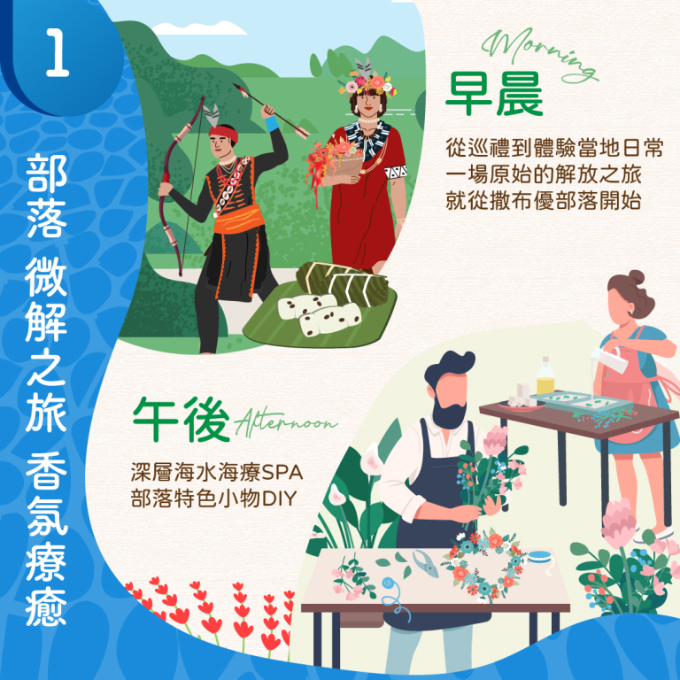 二種不同部落風情,體驗二種不同的文化深活,由當地族人帶您親自探訪部落,深入探索各部落的生活與特色活動,如打陀螺體驗或是環保食器、花環編織等,中午則享受一道道由部落婦女製作的特色的野食饗宴;活動的下半場,則來到深層海水中心,由專人做園區的導覽、 深層海水體驗和野菜皂或深層海水足浴包的DIY活動,讓身心獲得紓解的一場療癒之旅。