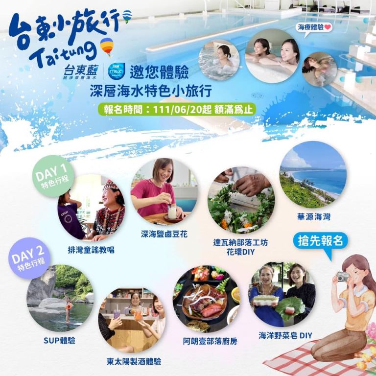 臺東縣政府為持續推廣深層海水產業將深層海水與地方觀光結合,以「台東藍」深層海水體驗為出發,特別推出一日遊、二日遊的旅遊體驗行程✨。