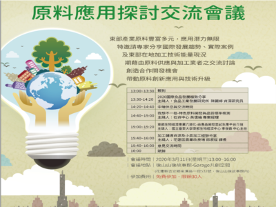 東部產業原料豐富多元,應用潛力無限。 本會議邀請專家分享國際發展趨勢、實際案例及東部在地加工技術能量現況,期藉由原料供應與加工業者之交流討論,創造合作開發機會,帶動原料創新應用與技術升級。