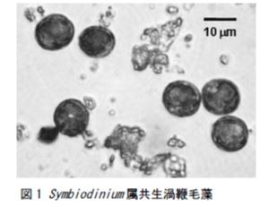微細藻類とは、水中に存在する顕微鏡サイズの藻類の総称である。微細藻類の中で、海洋渦鞭毛藻類は、生物活性を有する多くの代謝産物を生産している。中でも共生渦鞭毛藻類は海洋動物中に存在して共に助け合って生活を営んでいる。この藻類を動物体内から単離して、人工的に培養し、成育した藻類を用いて、生物活性を有する有用な代謝産物を探索する研究が可能である。高知大学の小野寺研究室では、この共生渦鞭毛藻類の一つで、シャコガイに共生しているSymbiodinium 属共生渦鞭毛藻(図1)を単離し、培養を行った。そして、この藻類代謝産物の生物活性を調査したところ、遅延性アレルギーに対して優れた抑制効果を示すことが明らかとなった1)。この藻類の培養は海水を用いて行うが、従来方法であるフラスコ培養では一度に2 L 程度しかできなかった。本研究では、段階的にスケールアップを行うことで、最大1,000 Lのアルテミア水槽での大規模培養に成功した。