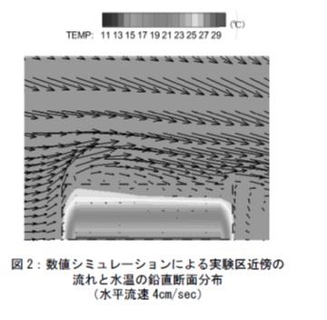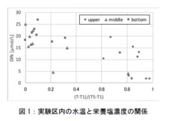 図1に実験区内の水温と栄養塩濃度の関係を示す。図の横軸は、実験区内測定点(上層(upper)、中層(middle)、底層(bottom)3箇所)での水温(T)と注入深層水温(T1)との差の、周辺海域水温(T5)と注入深層水温の差に対する比である。つまり横軸は、実験区内水温が注入深層水温と等しい時に0、実験区内水温が周辺海域水温と等しい時に1 となる。実験区内水温が注入深層水温に近い時に栄養塩濃度は高く、実験区内水温が周辺海域水温と近い時には栄養塩濃度は低くなるという傾向が見られ、注入深層水と周辺海水の混合の度合いによって、実験区内の栄養塩濃度が決まっていることがわかる。また、実験区内底層や中層では概ね深層水が高い割合で滞留しており高栄養塩濃度が維持されているが、実験区外部の流速が大きいときや注入する深層水流量が小さい場合には、上層と同程度まで周辺海水と混合することがある。図2に数値シミュレーションによって得られた実験区近傍の流れと水温の鉛直断面分布の一例を示す。図中の破線は実験区コンテナの位置を示しており、内部に低温の深層水が滞留している様子が再現されている。また、海域の水平流速が大きくなると、コンテナ上面付近に生成される渦状の流れによってコンテナ内外の海水混合が促進されることなどが明らかになった。
