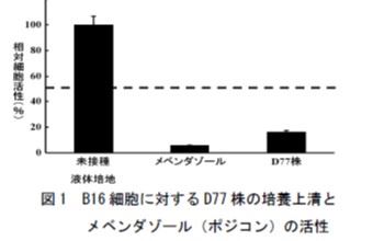 伊豆赤沢のBF より合計98 株の放線菌が分離された。このうち、1 株(D77 株)に強い活性が見られた(図1)。また、この株の培養上清を終濃度0.01~5%にして同様の細胞試験を行ったところ、添加濃度依存的に活性が見られた。一方、光学顕微鏡による観察でも添加濃度依存的にメラニンの生産が抑えられる傾向が見られた。次に16S rRNA 遺伝子解析による種の同定の結果、、D77株はStreptomyces fulvissimus の近縁種(相同性99.18%)と同定され、この標準菌株との分類学的性状の比較において両者はほぼ一致した。しかしながら、B16 細胞に対する活性は、標準菌株には見られ、D77 株のみに見られた。この結果から, D77 株は標準菌株が生産しない活性物質を生産していることが示唆された。今後、D77 株が生産する活性物質の培養上清からの単離・精製を進めるとともに、メラニン生産抑制作用について詳細に検討を進める予定である。