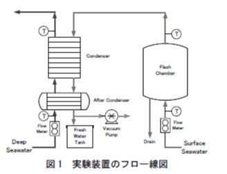 図1 に海水淡水化装置の実験装置のフロー線図を示す。造水原理は、表層海水を飽和蒸気圧以下に減圧することで、その海水の一部が蒸発し、海洋深層水でその蒸気を凝縮することで淡水を得る。表層海水は、フラッシュチャンバー内で上向きに放出され、スプレーフラッシュ蒸発する。表層海水が蒸発する際、海水中の溶存ガスが海水から分離される。そのため、一部温水配管系統は、この分離された不凝縮ガスを除去する目的で、真空ポンプを連続的に運転し、飽和蒸気圧力に制御される。なお、表層海水中の塩分などの物質は、蒸発しきれなかった海水と一緒に排水される。本装置では、凝縮器で凝縮しきれなかった蒸気は、補助凝縮器で完全に凝縮した後、清水タンクに貯蔵される。