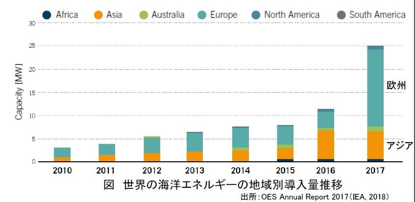 再生能源發展已成為主要替代能源之選項,隨著目標量逐年提高也將面臨更多挑戰,海洋能源研究正處於發展過程中,若能夠充分利用海洋能源諸如:海洋溫差、波浪能、海流能、潮汐能等,就能有效的即解決人類能源問題。目前,海洋能發電技術的發展主要分佈於歐洲與美國,而四面環海的日本對於海洋能的發展近年來也持續開發與投入研究。在能源應用的部份,則是主要是以波浪能和潮汐能為主(如圖1),按國家劃分的主要波浪發電項目數量約60%的項目位於歐洲,其中約一半位於英國。
